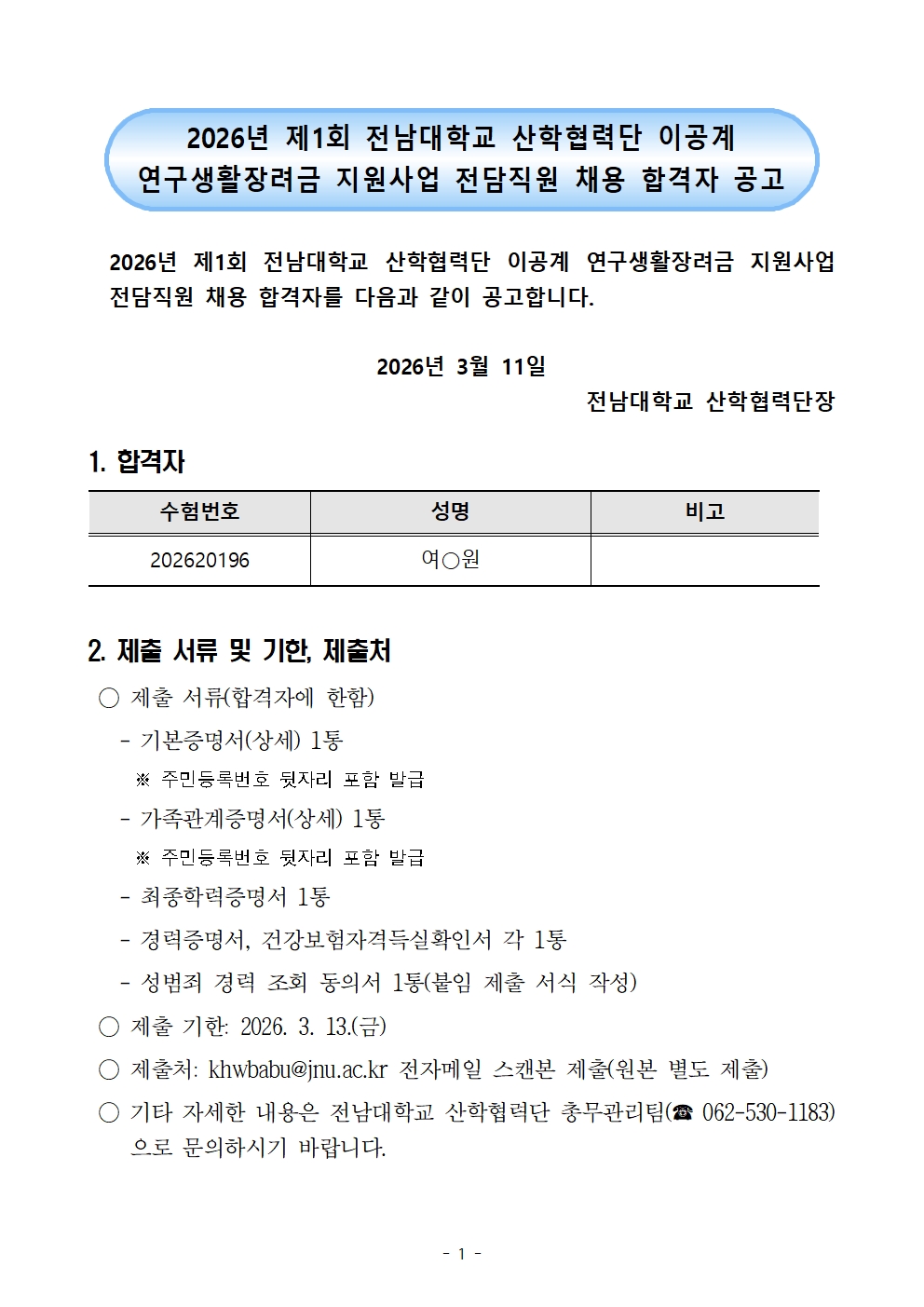 2026년 제1회 전남대학교 산학협력단 이공계연구생활장려금 지원사업 전담직원 채용 합격자 공고